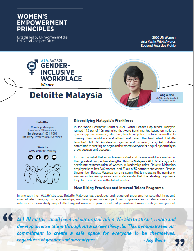 Read this Asia-Pacific WEPs Awards Regional Awardee Profile to learn more about the 2020 Gender-inclusive Workplace Winner, Deloitte Malaysia.