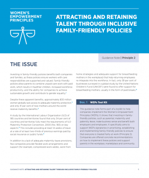 This guidance note forms part of a toolkit to help companies implement the Women’s Empowerment Principles (WEPs). It shows that investing in family-friendly policies, such as parental, maternity and paternity leave, make business sense and benefit both employers and employees. It specifically aims to support WEPs signatories in prioritizing, establishing and implementing family-friendly policies to ensure that everyone is treated fairly at work (Principle 2).