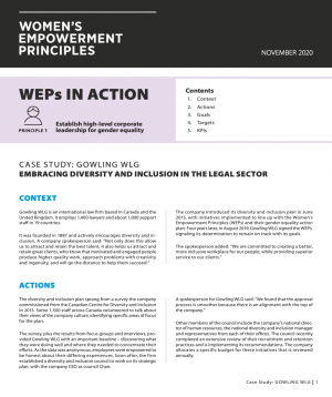 Read this case study with Gowling WLG, an international law firm based in Canada and the United Kingdom. The company actively encourages diversity and inclusion with several initiatives lined up with the Women's Empowerment Principles. The case study explores how Gowling WLG's actions, goals, targets, and KPIs relate to Principles 1, 2, 4, and 6.