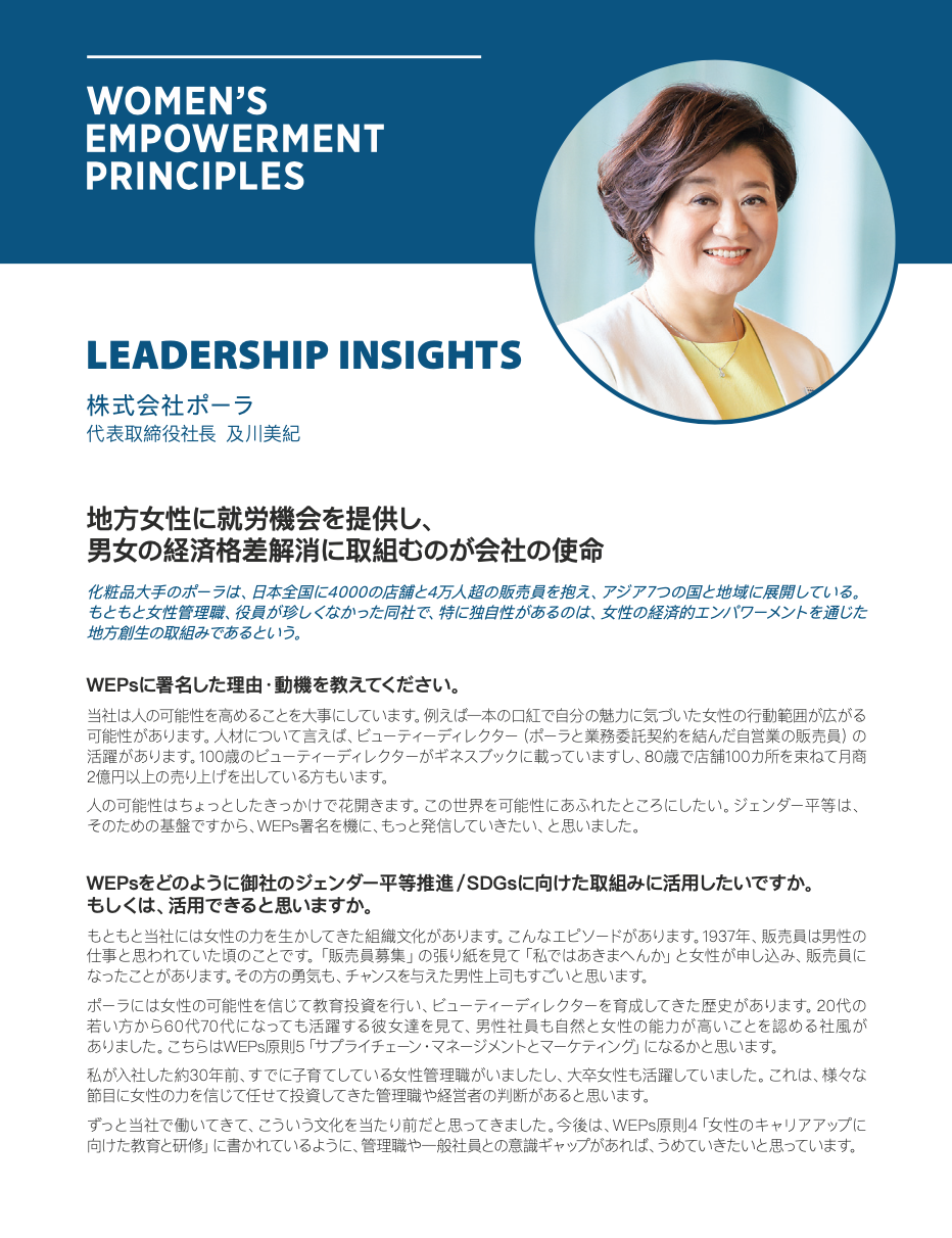 POLA Inc. President Miki Oikawa, first female president to head a major cosmetic company in Japan, shares with us how the WEPs support advancing their long-standing commitment and actions to promote gender equality.